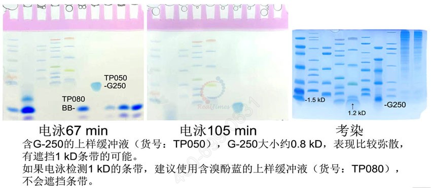 2×Tricine多肽上樣緩沖液(變性,還原,含溴酚藍(lán))(Reducing Tricine Sample Loading Buffer,2×),是一種經(jīng)過改良的以溴酚藍(lán)為指示前沿的多肽電泳上樣緩沖液。本產(chǎn)品含SDS變性試劑和還原試劑,應(yīng)用于Tricine-SDS-PAGE的蛋白樣品制備和上樣。與傳統(tǒng)的多肽上樣緩沖液(貨號(hào):TP050)不同的是,TP080緩沖液含有溴酚藍(lán)作為指示前沿,不會(huì)出現(xiàn)電泳結(jié)束后經(jīng)典上樣緩沖液中的考馬斯亮藍(lán)G-250不會(huì)遮擋1 kD位置的條帶。