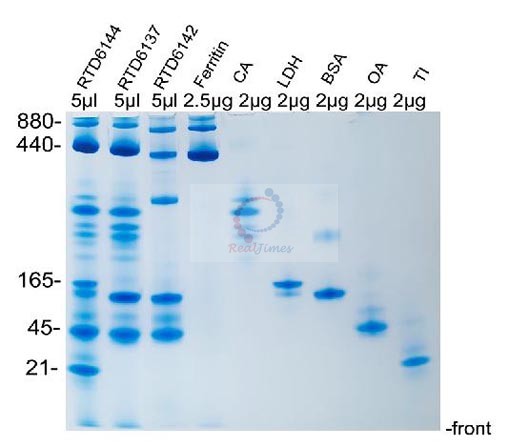 特別說明:由于本系統(tǒng)采用非連續(xù)Laemmli凝膠系統(tǒng)(Tris-Glycine系統(tǒng)),電泳凝膠系統(tǒng)pH在8.3-8.8,因此要求待分離的蛋白等電點pI≤8.0(酸性蛋白),這樣蛋白在凝膠系統(tǒng)內(nèi)帶負電荷,pI越低于8.0,帶更多的負電荷,在凝膠電泳中才能正常向正極泳動。如果待分離的蛋白等電點pI>8.0(堿性蛋白),請選擇堿性電泳凝膠系統(tǒng)分離(貨號RTD6131)。